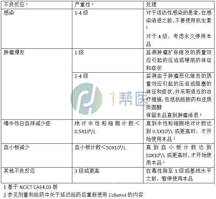 根据临床表现识别细胞因子释放综合征(CRS),评估和治疗发热、缺氧和低血压的其他原因。如果怀疑有细胞因子释放综合征(CRS),保留Columvi并根据表4中的建议和当前的实践指南进行管理;管理细胞因子释放综合征(CRS)的支持性护理,可能包括重症或危及生命的重症监护