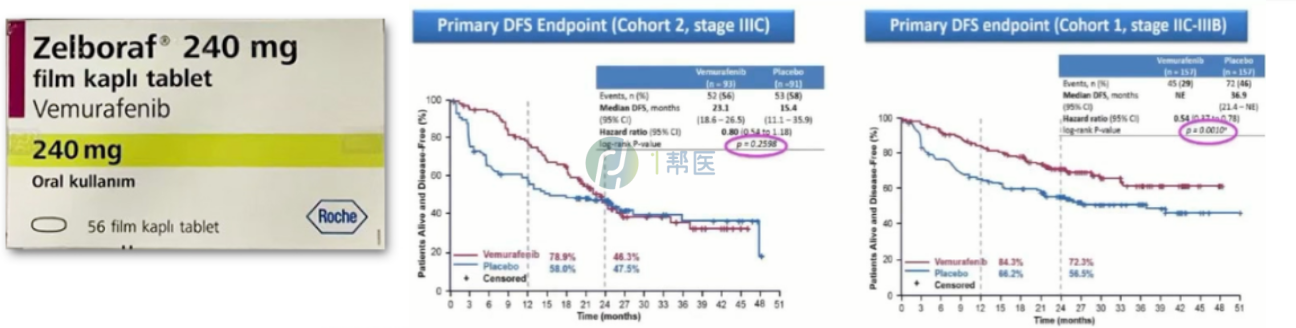 罗氏公司开展的在恶性黑色素瘤中,使用维莫非尼(维罗非尼、威罗菲尼)术后辅助治疗的研究,研究设立了晚期和早期两个人群,通常情况下,需先检验晚期人群再检验早期人群,恰恰相反,在该试验中,晚期IIIC期的P值为0.2598,是一个阴性的结果,反而早期人群中P值为0.001,是一个阳性的结果,所以该试验的结论指出,即使在早期人群中P值<0.05,也只能认为是一个探索性的数据,并不具有统计学意义。
