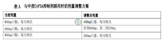 剂量,表3总结了本药与中度CYP3A抑制剂联用时的剂量调整方案,停用中度CYP3A